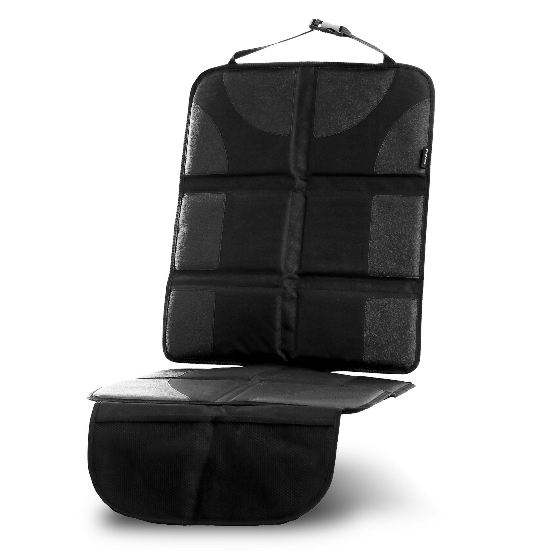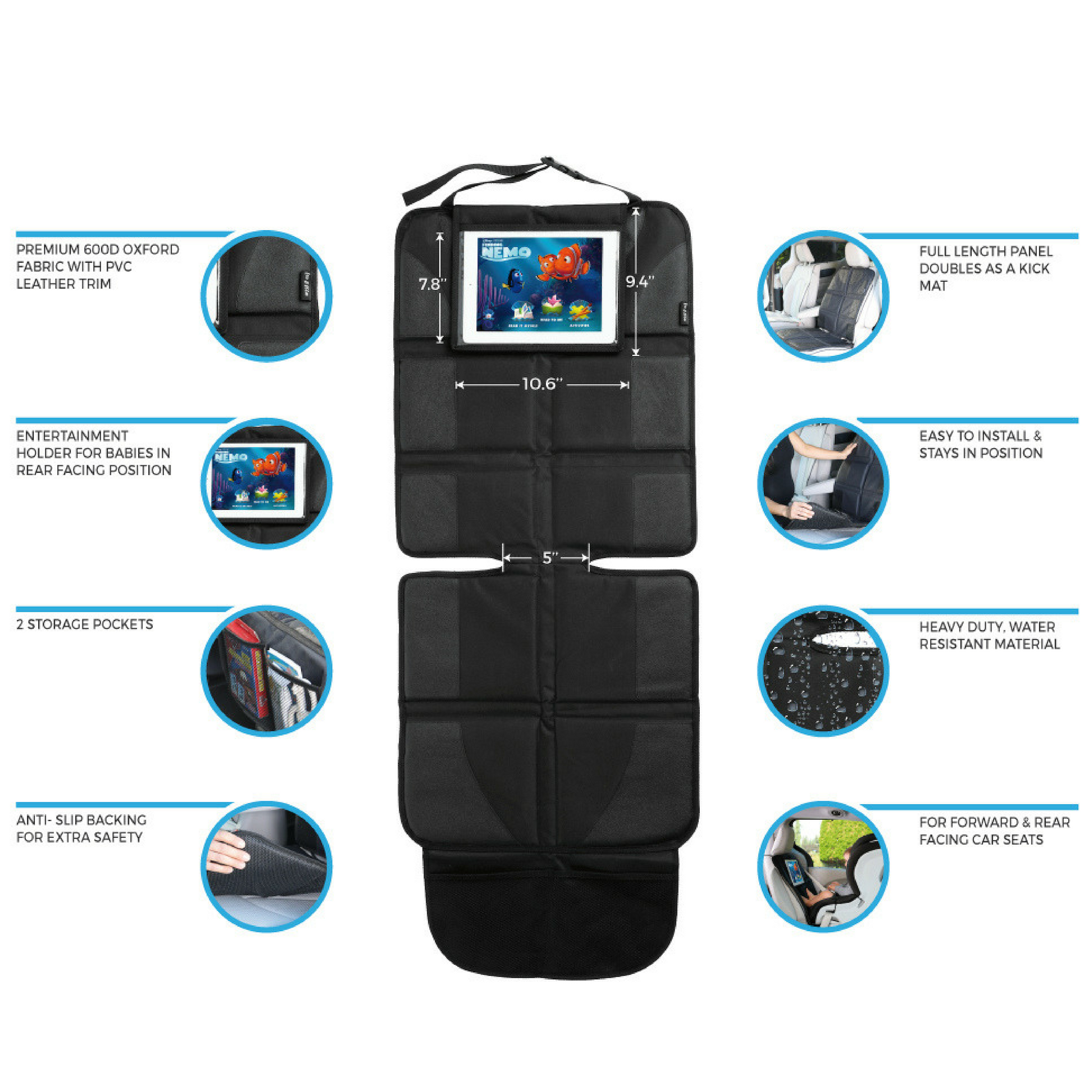 This car seat protector is made from thick, 600D Oxford fabric which has an anti-slip bottom to stay securely in place. The protector has a tablet holder for babies to watch their favourite videos and music in a rear facing seat position. A perfect travel accessory to prevent damage and keep babies entertained.